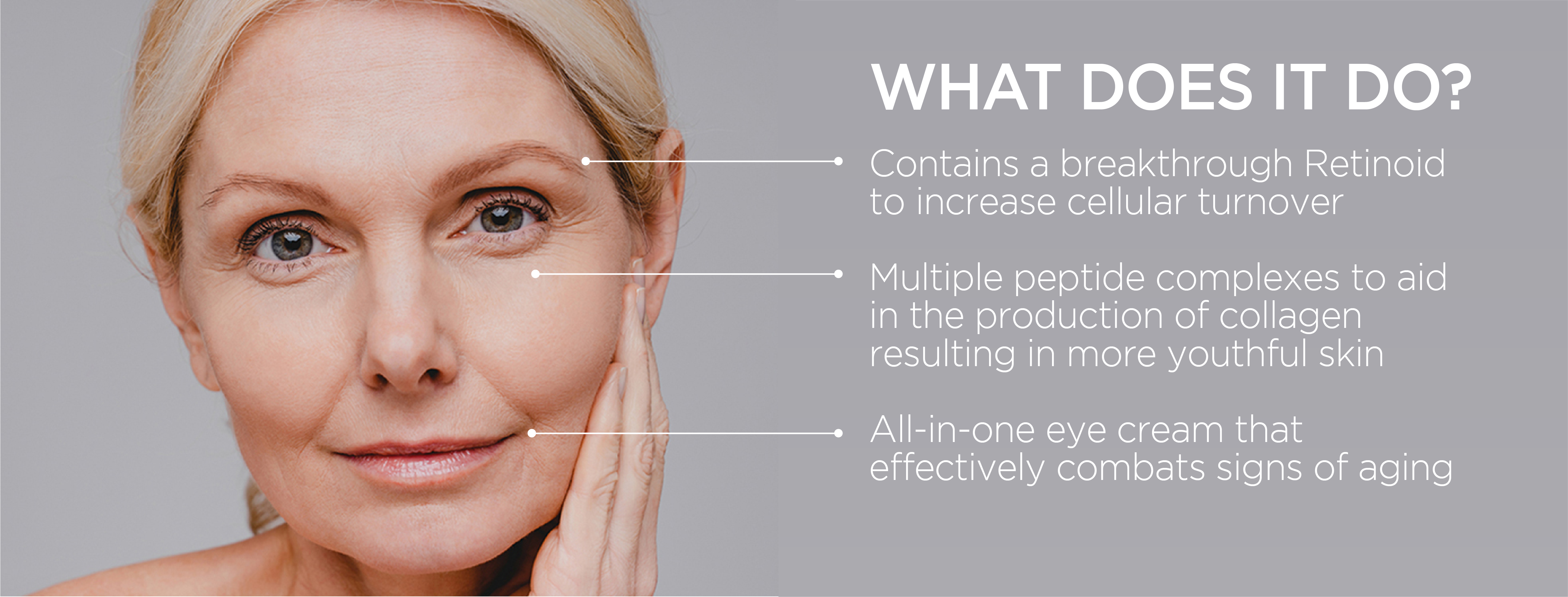 A clinically proven combination of ingredients reduces the appearance of dark circles, puffiness, and wrinkles around the eye area. Powerful peptides, a breakthrough Retinoid, and vitamins promote collagen growth, strengthen capillaries and stimulate circulation, resulting in a brighter, rejuvenated and refreshed look.