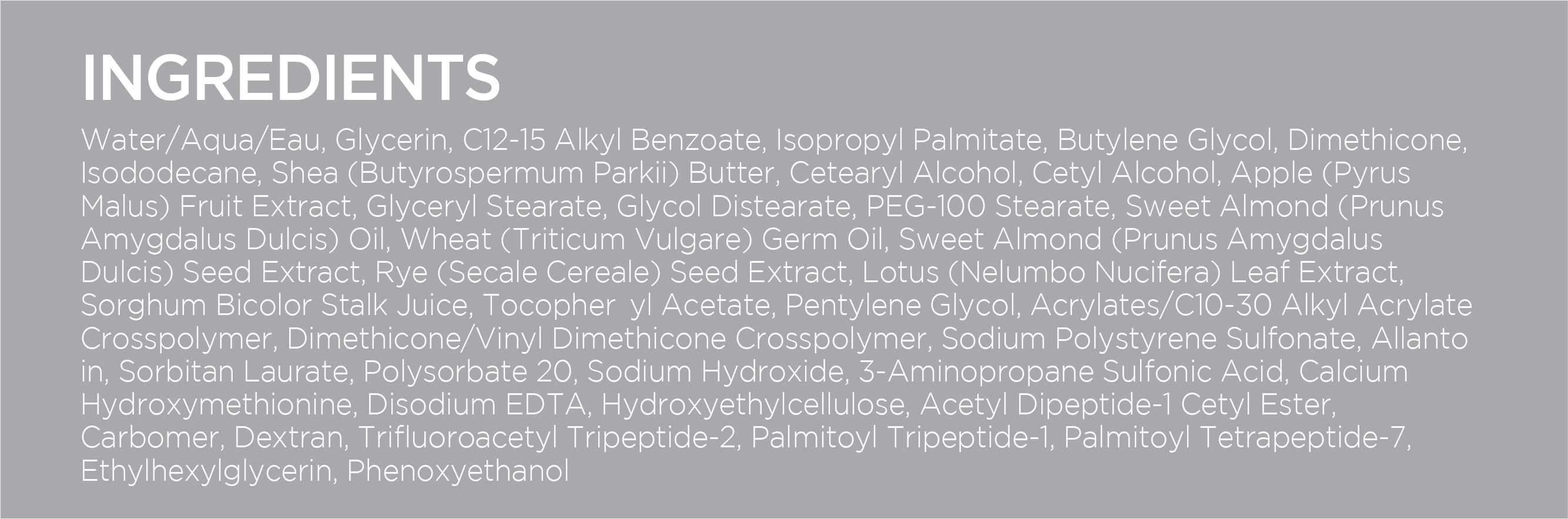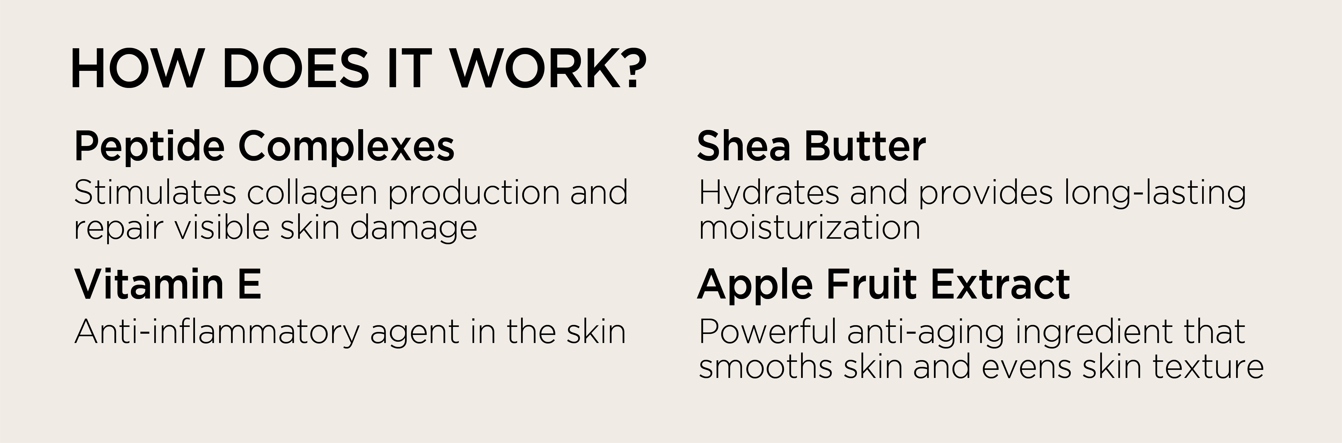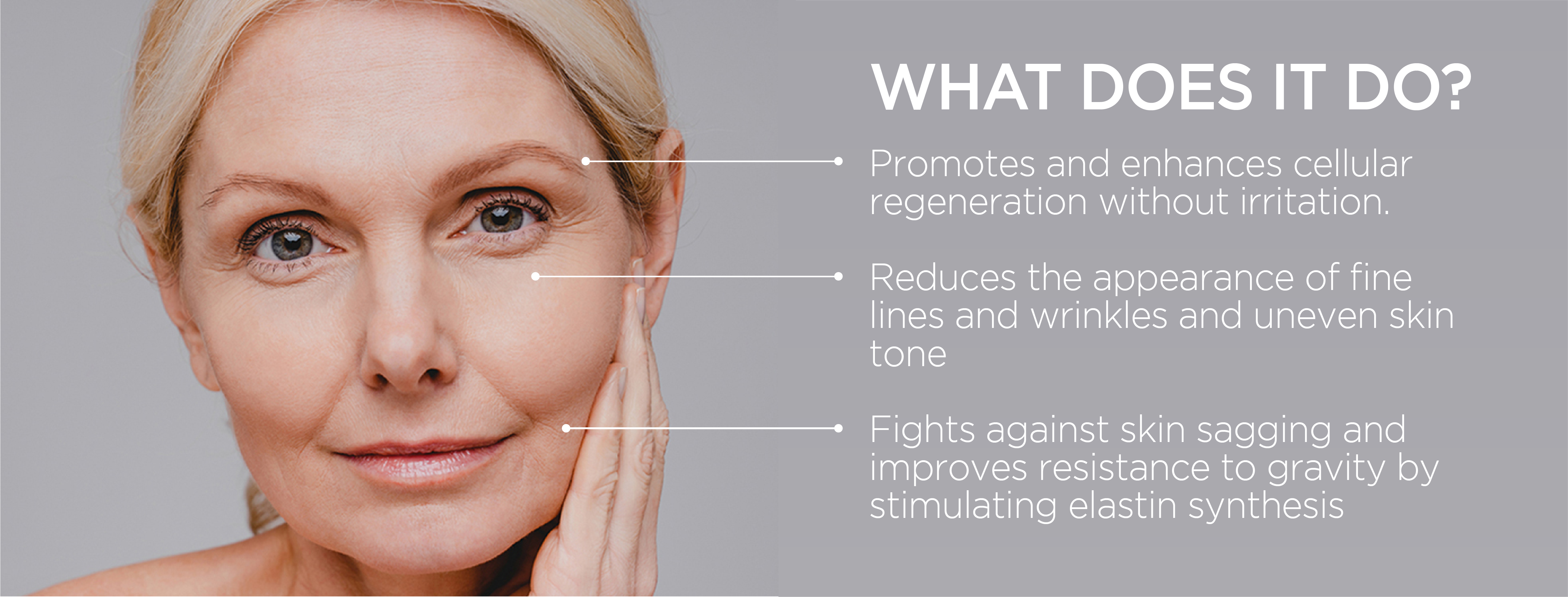- Fights against sagging of the skin and improves resistance to gravity by stimulating elastin synthesis