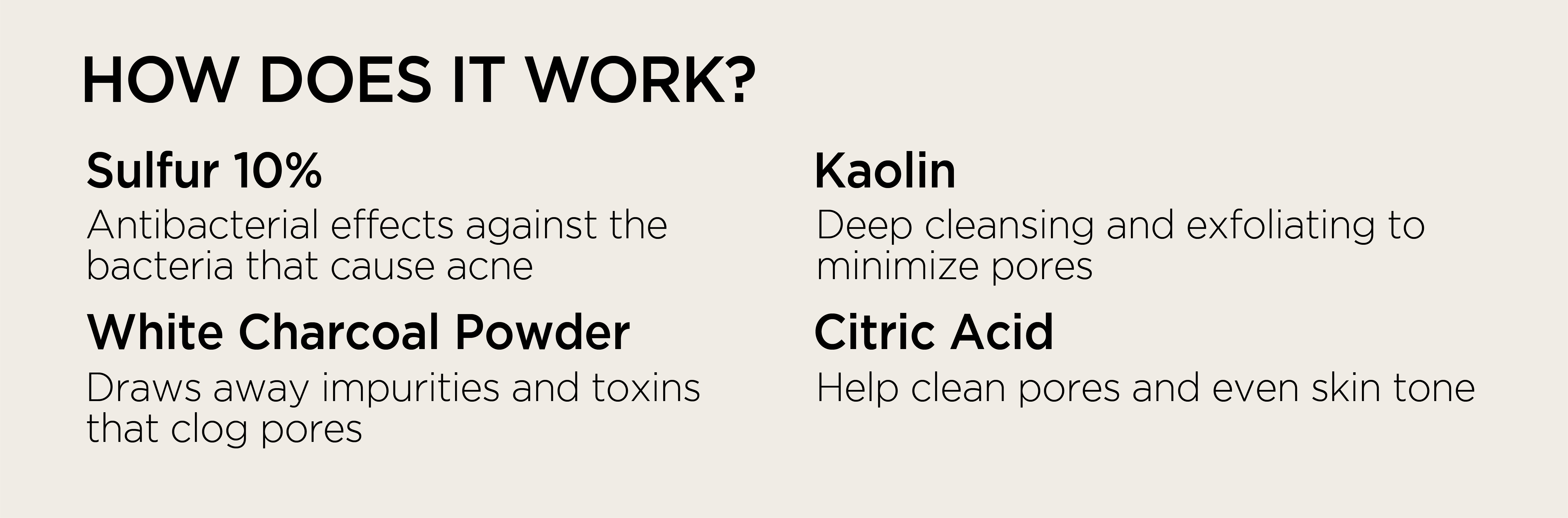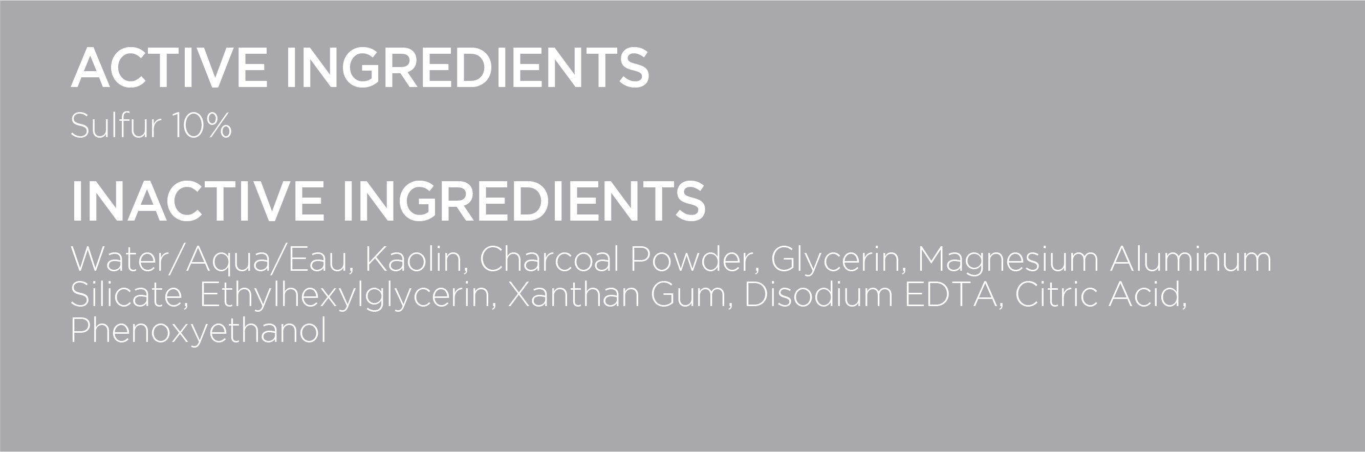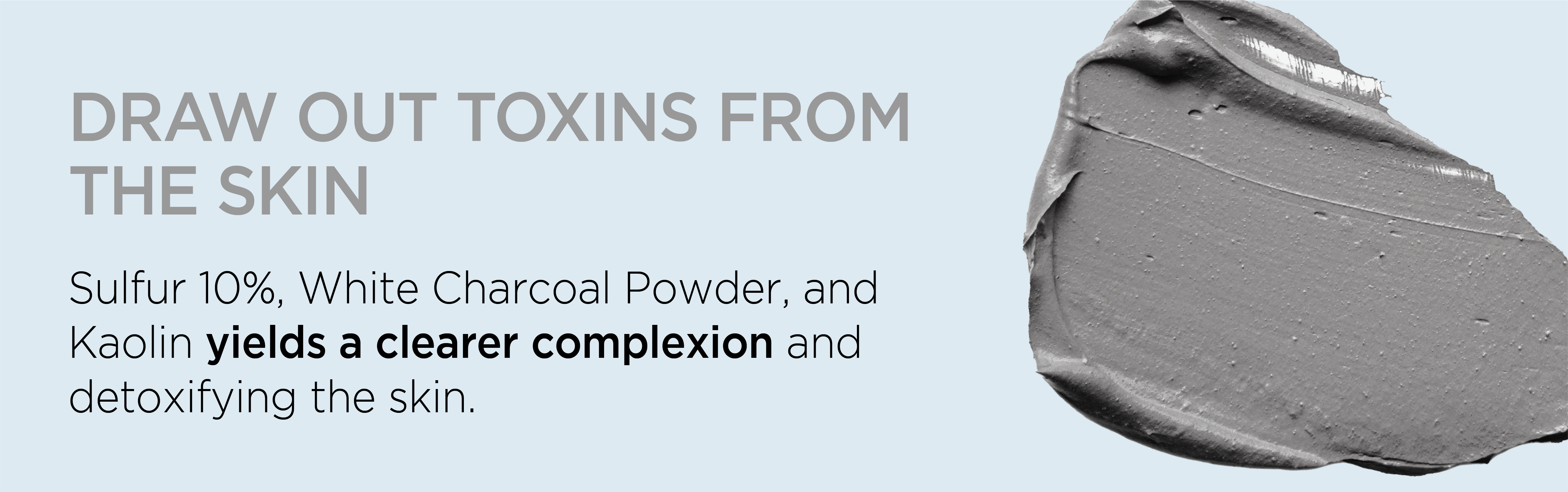 A breakthrough mask contains Sulfur 10%, Charcoal Powder, and Kaolin to effectively absorb oils, impurities, and other toxins from the skin yielding a clearer complexion, reducing breakouts, and detoxifying the skin. The powerful combination of ingredients works to draw out all the toxins from the skin fighting against breakouts as well.