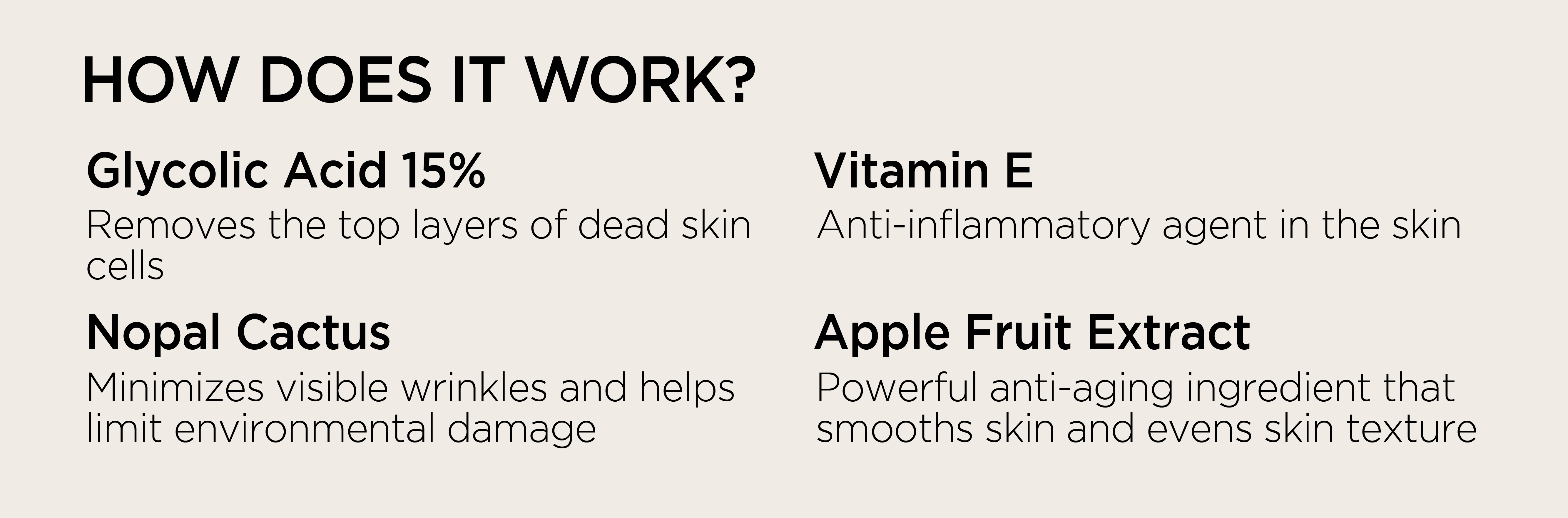 - Contains an Alpha Hydroxy Acid, 15% Glycolic Acid, as well as skin-soothing botanical extracts
