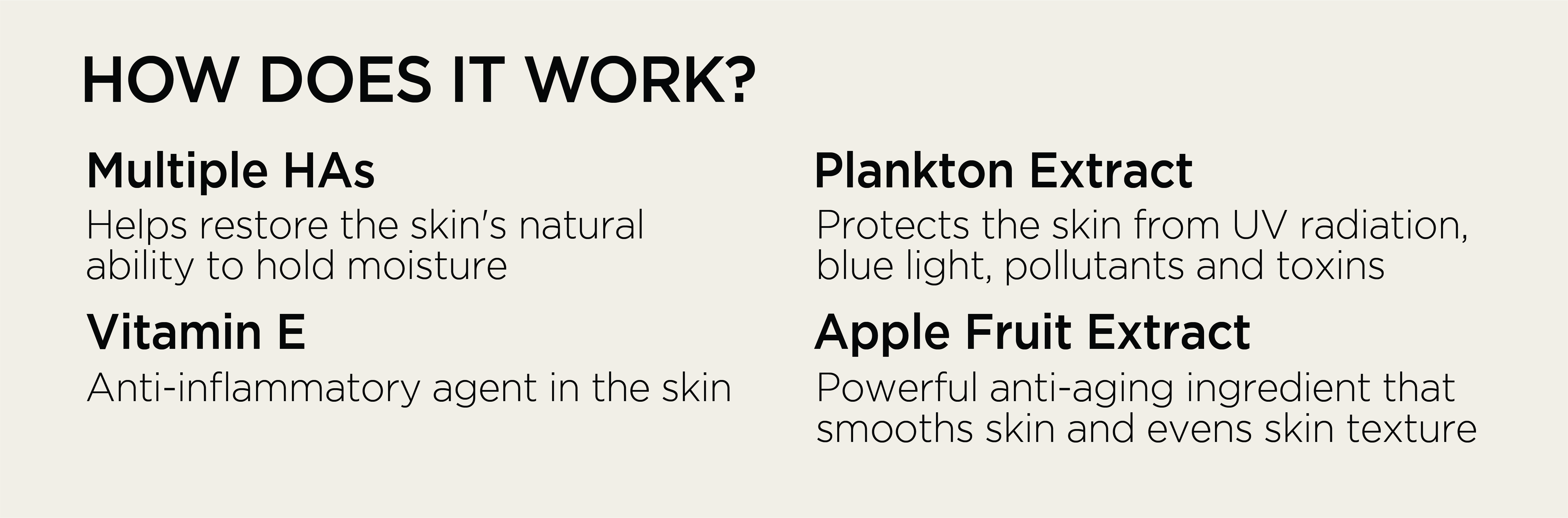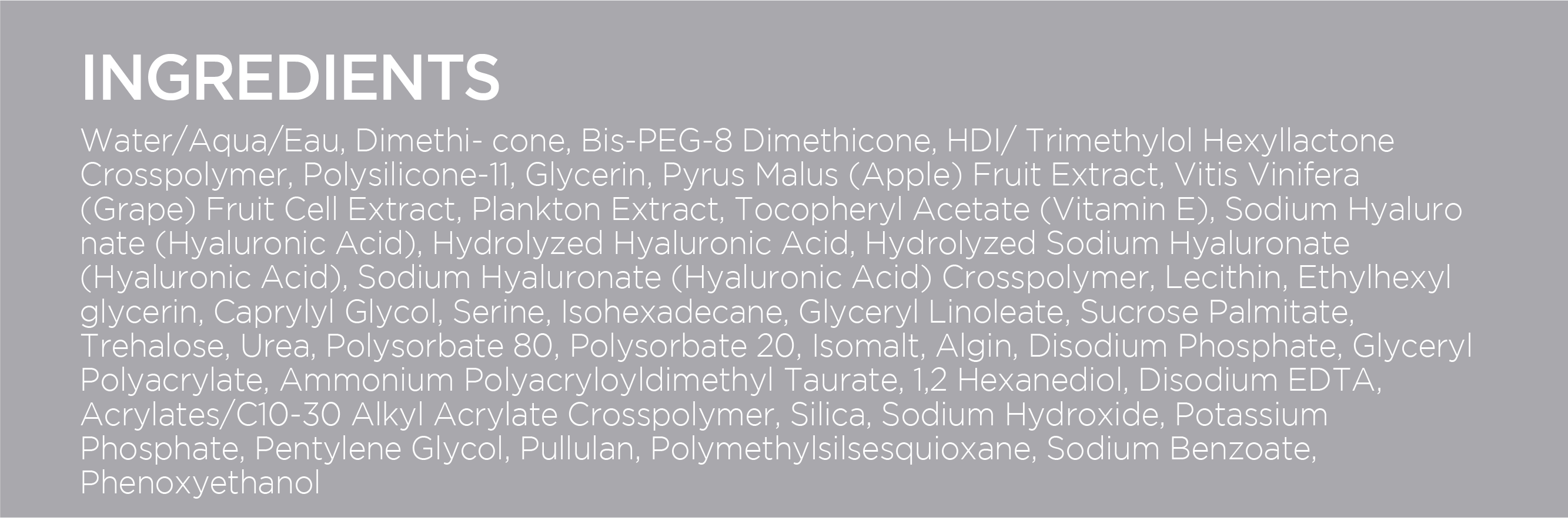 Formulated with our proprietary Trans-Epidermal Carrier, peptide complex and several different forms of Hyaluronic Acid, this product provides superior hydrating abilities, improves the skin's texture, fine lines and wrinkles and supports rejuvenation and hydration.