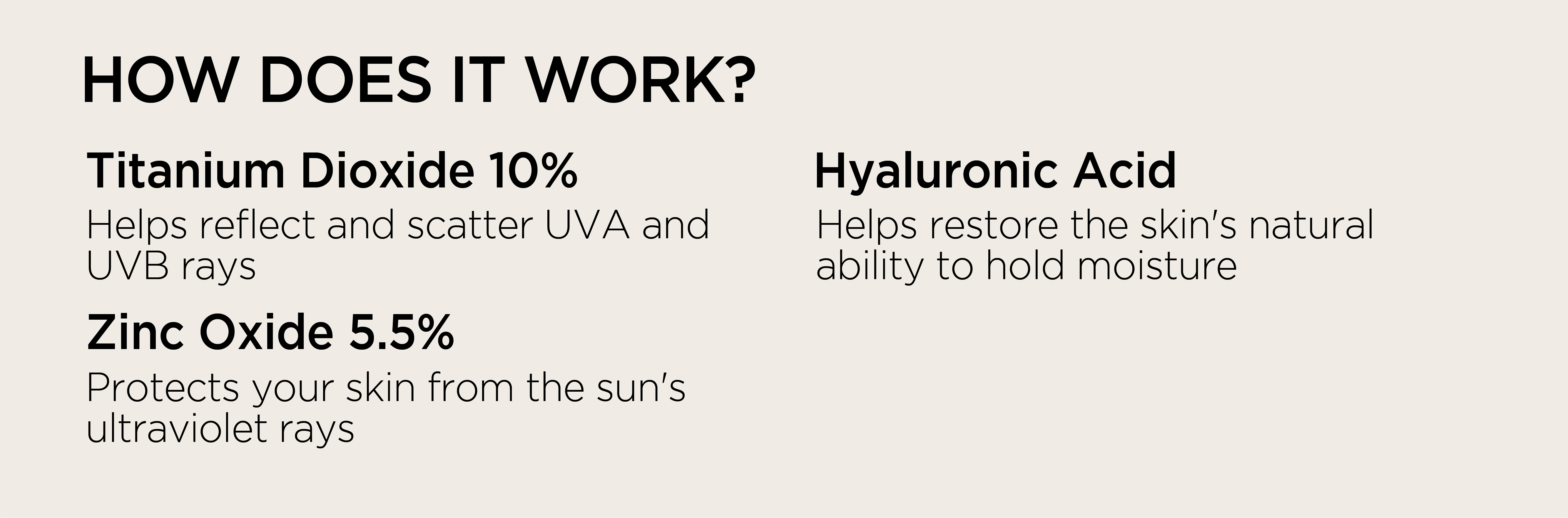 - 100% physical sunscreen combined with a moisturizing base and sheer, universal tint