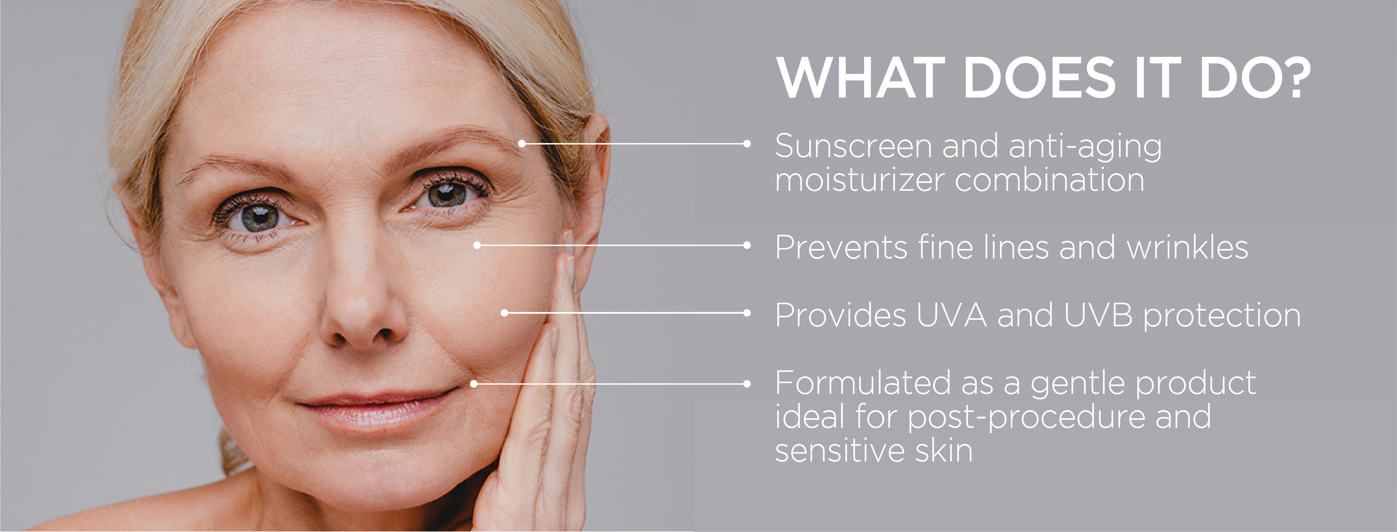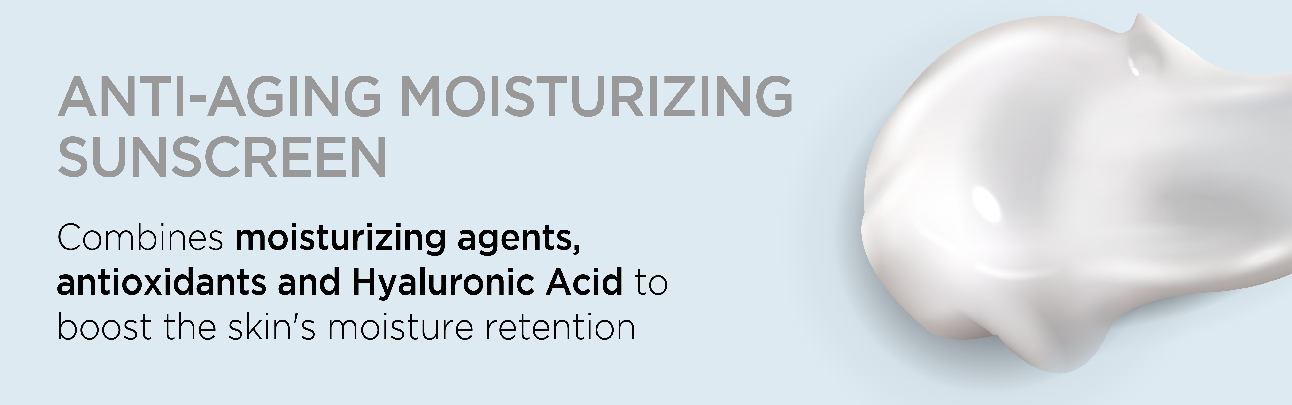 Combining the power of an anti-aging moisturizer with a broad-spectrum sunscreen and is ideal for daily use to incorporate into any regimen. This product contains a blend of moisturizing agents, antioxidants, and Hyaluronic Acid to boost the skinβs moisture levels, prevent fine lines and wrinkles and protect the skin against UVA and UVB rays.