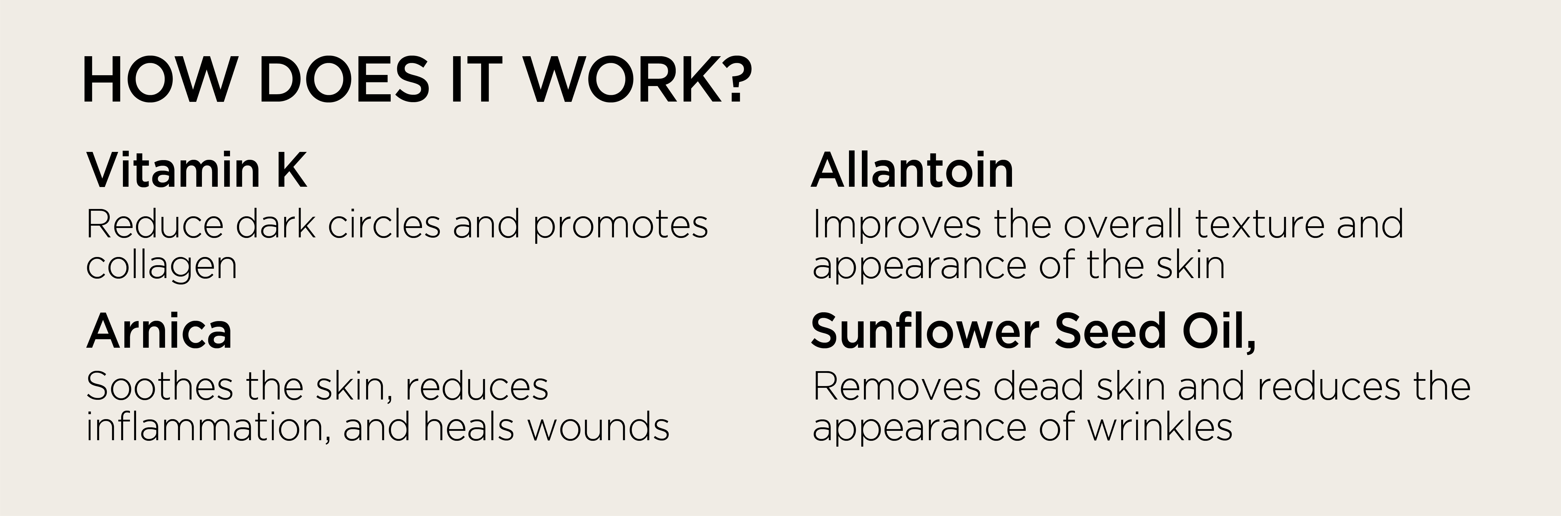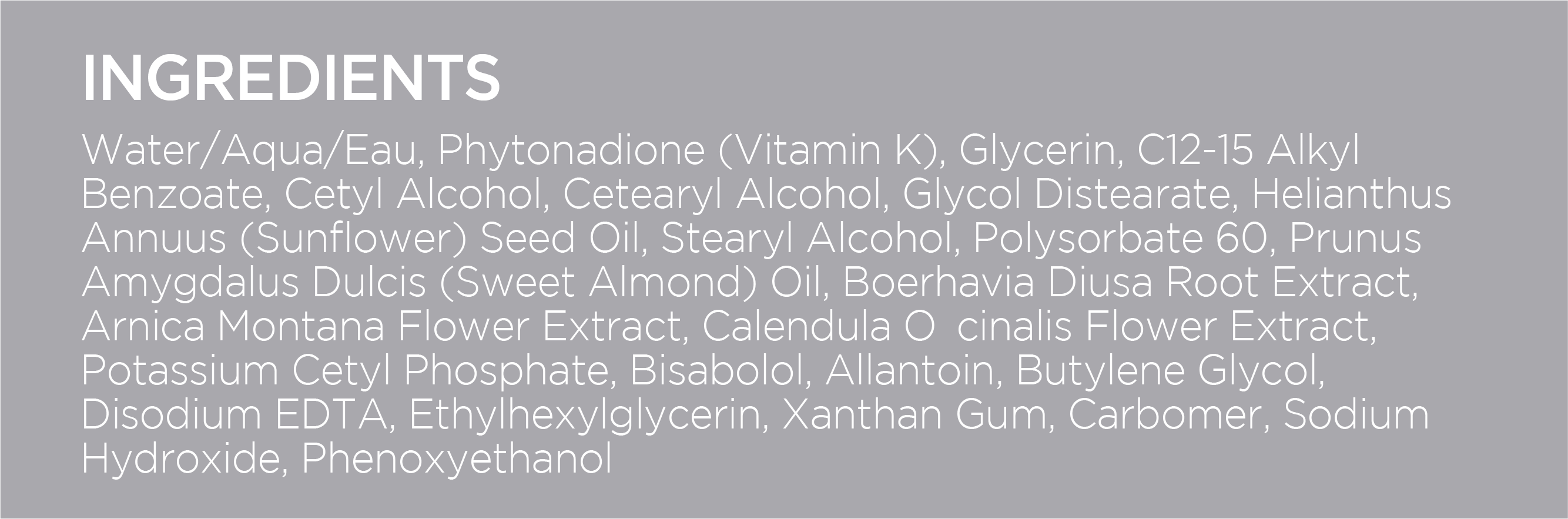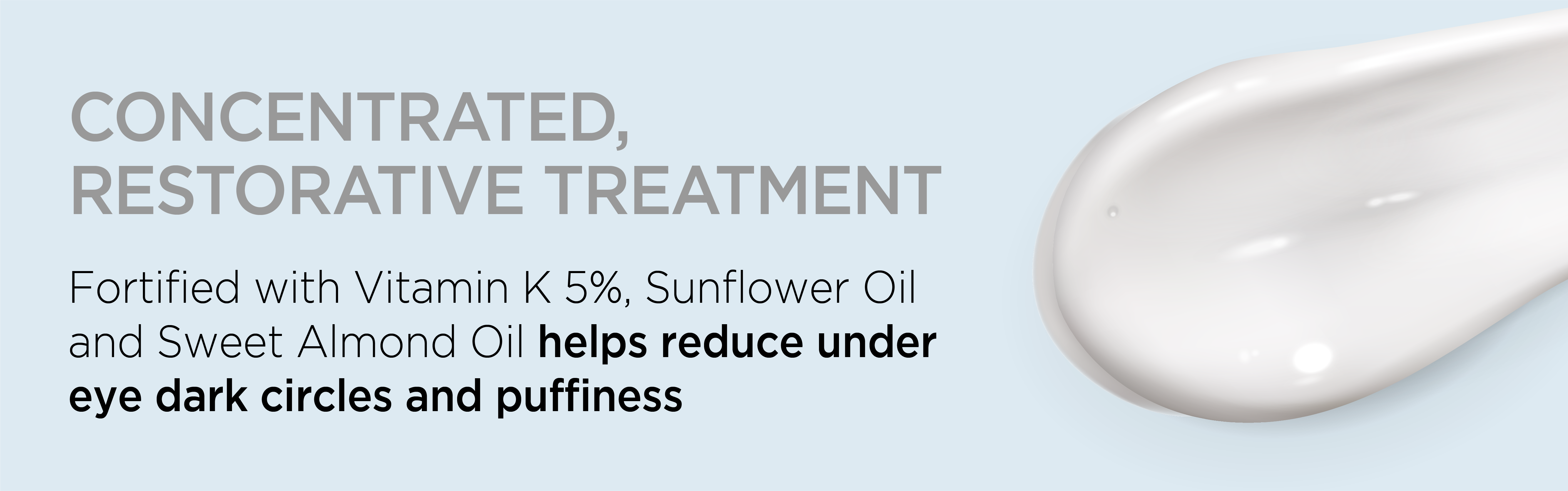 Concentrated, restorative treatment with Vitamin K, Arnica, Sunflower and Sweet Almond Oil, helps fade under-eye dark circles and puffiness, while also clearing discolorations associated with Rosacea and broken capillaries. Ideal therapy for fragile, post-procedure skin.
