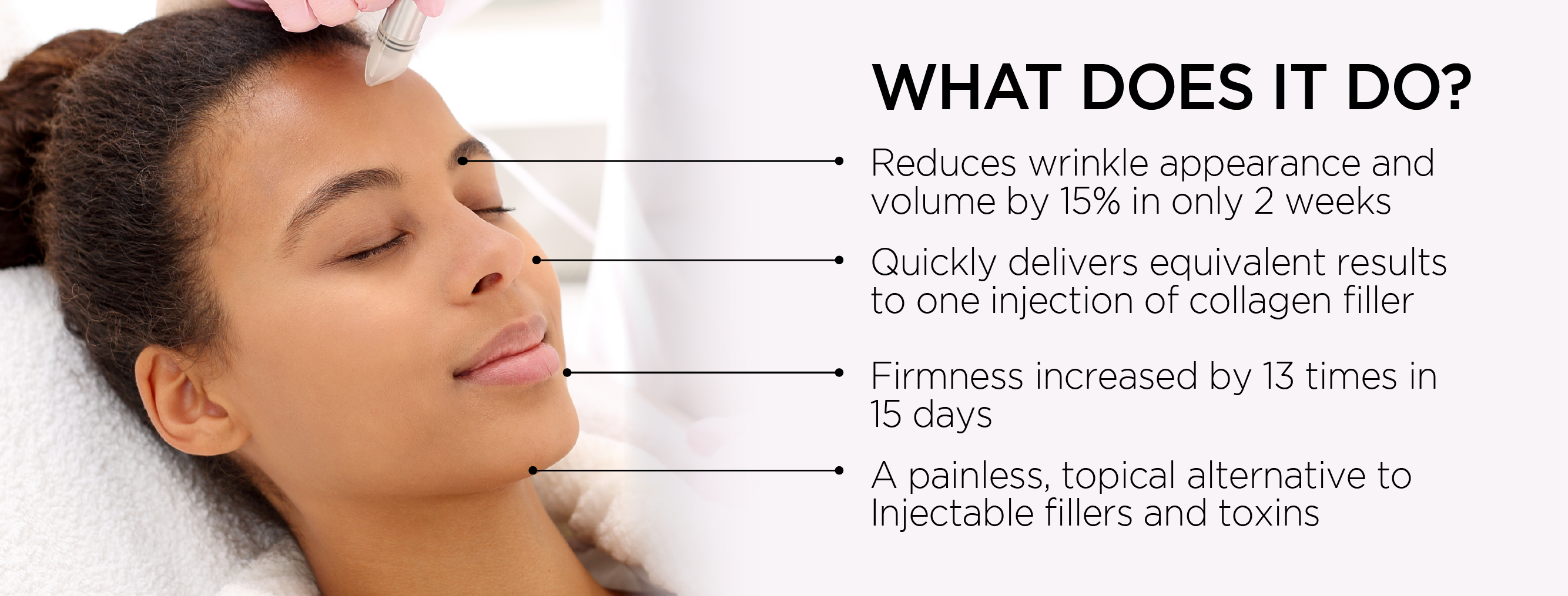 - Quickly delivers equivalent results to one injection of collagen filler within 2 weeks of use