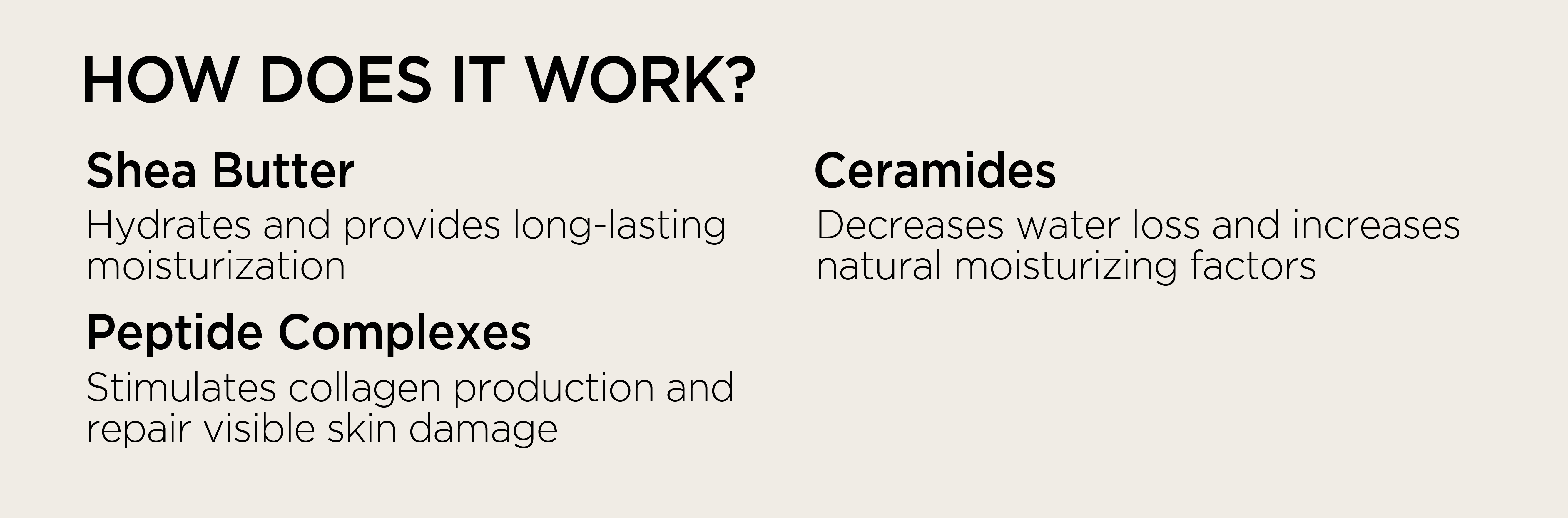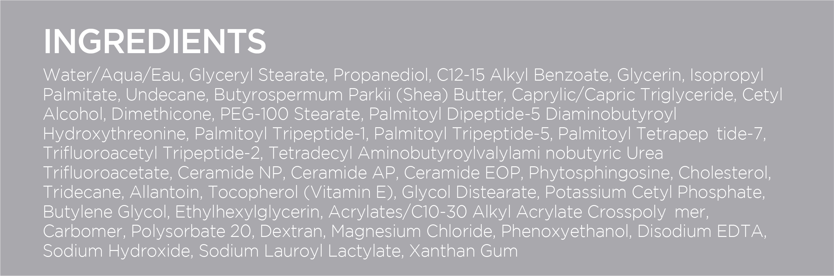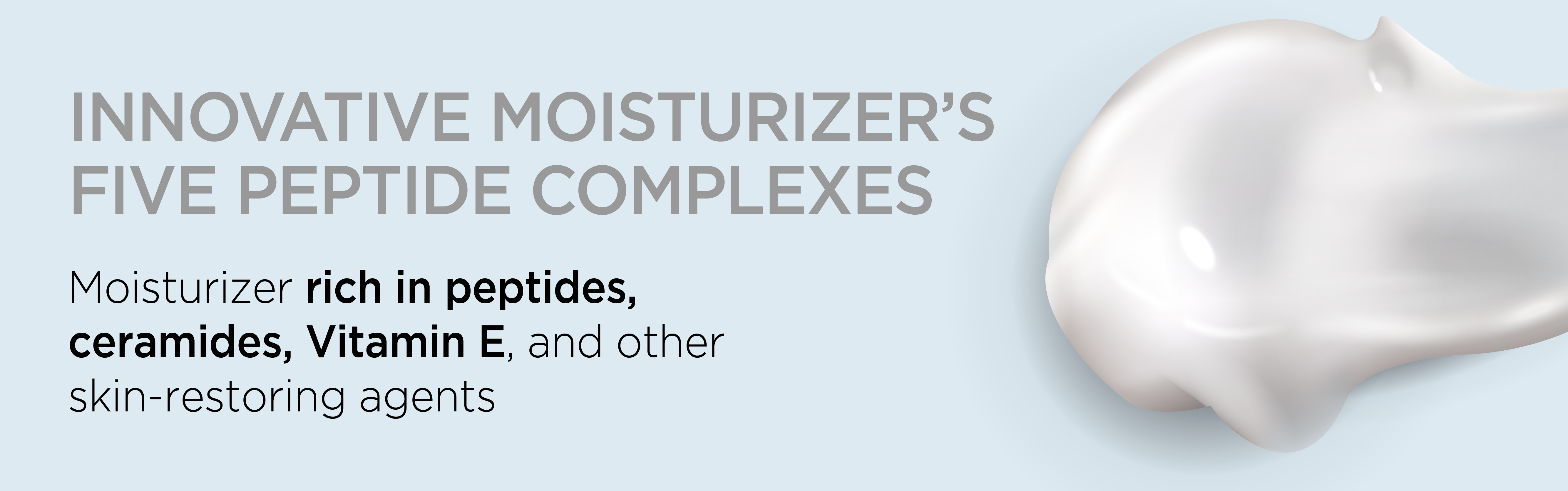 Moisturizer rich in peptides, ceramides, Vitamin E, and other skin-storing agents formulated to fight against signs of aging and hydrate dry skin, restoring a youthful, healthy glow. This innovative moisturizer's five peptide complexes stimulate collagen production, repair visible skin damage, increase the appearance of skin's firmness and elasticity and replenish the skin's surface to calm signs of sensitization. Also, ceramides present effectively improve the look and feel of dry, dehydrated skin, while Vitamin E protects the skin against environmental stressors and sun damage.