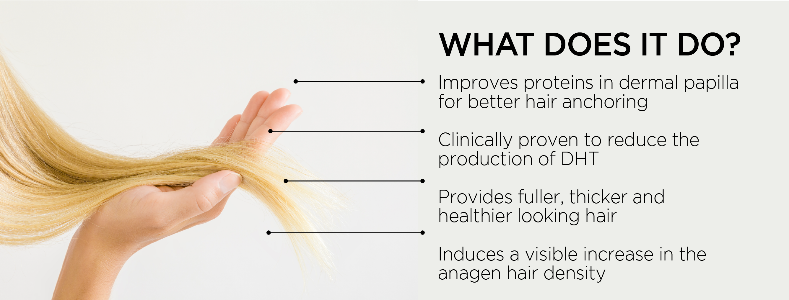 - Improves proteins in dermal papilla for better hair anchoring