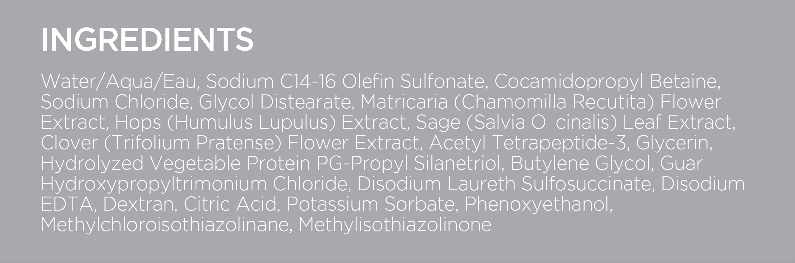 Ingredient Highlights: Clover (Trifolium Pratense) Flower Extract, Matricaria (Chamomilla Recutita) Flower Extract, Hops (Humulus Lupulus) Extract, Sage (Salvia Officinalis) Leaf Extract, Acetyl Tetrapeptide-3
