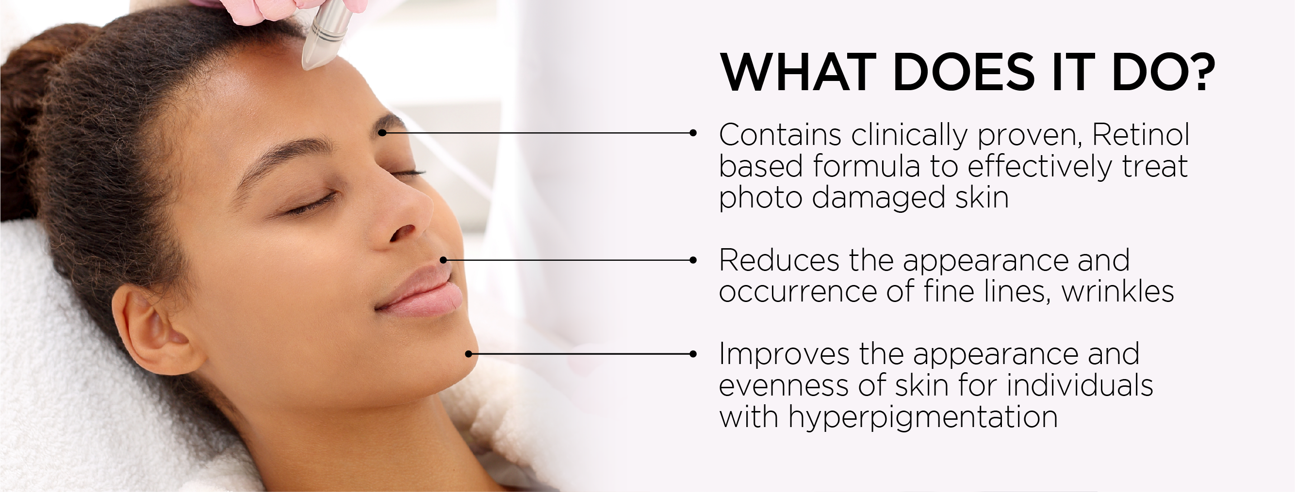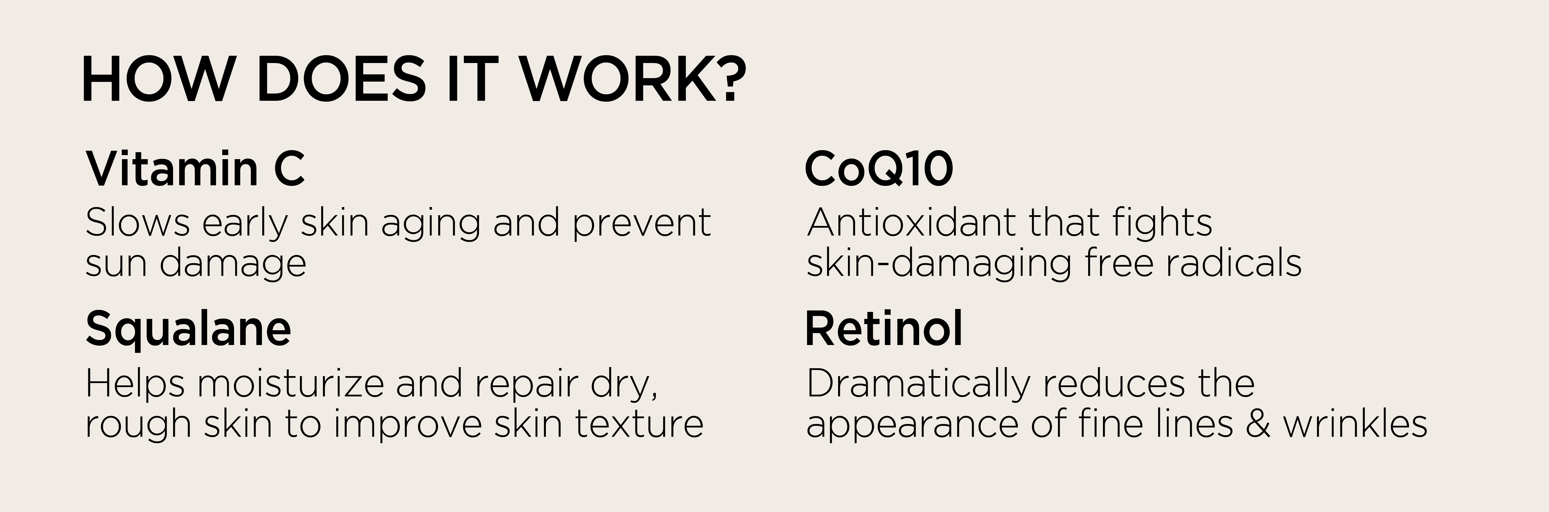 - Contains clinically proven Retinol-based formula with Vitamin C, Squalane, and Coenzyme Q10, to effectively treat photodamaged skin
