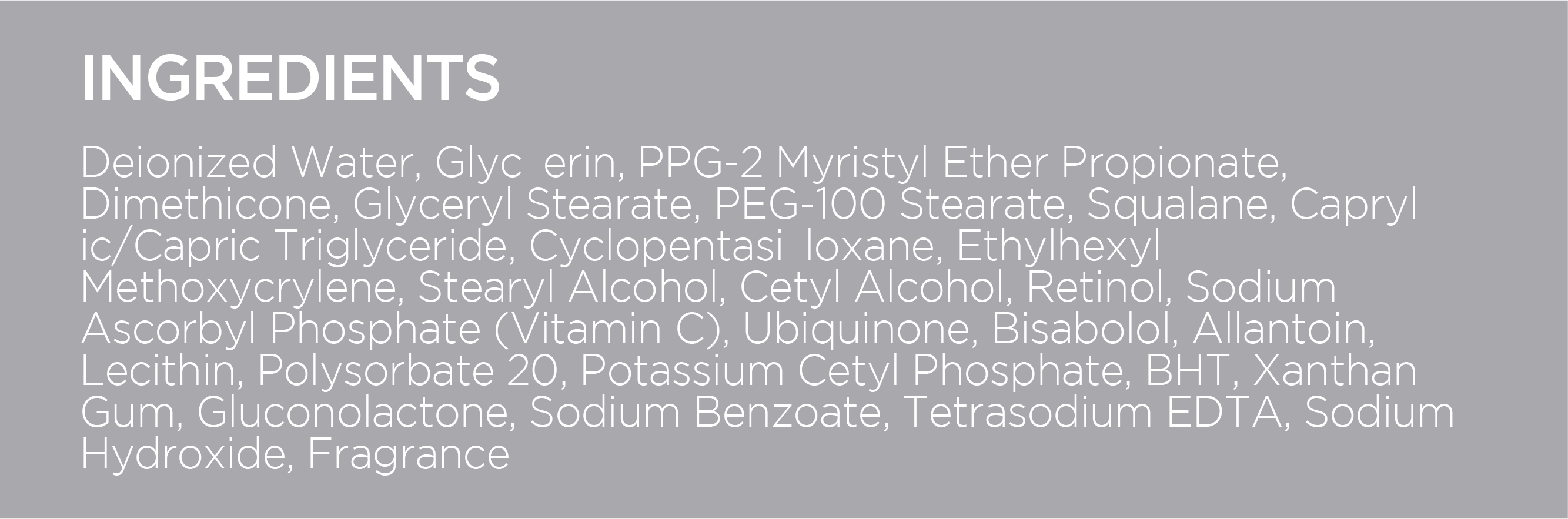 Advanced formula containing Retinol, Vitamin C and Coenzyme Q10 visibly reduces fine lines and wrinkles through increased cellular turnover, while enhanced collagen synthesis promotes healthy, more youthful looking skin. In addition, this serum effectively provides protection against free radicals and sun damage, resulting in visibly brighter skin.