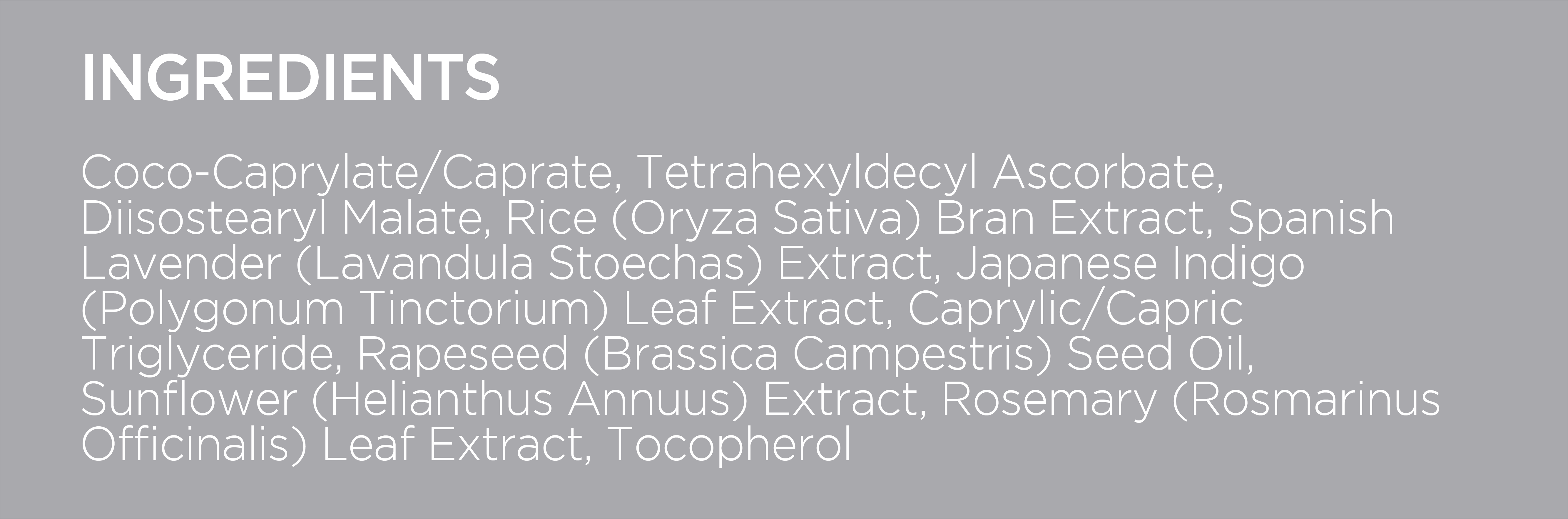 Ingredient Highlights: Tetrahexyldecyl (THD) Ascorbate 20%, Vitamin E, Lavendar Extract, Caprylic/Capric Triglyceride, Japanese Indigo Leaf Extract, Rapeseed Seed Oil
