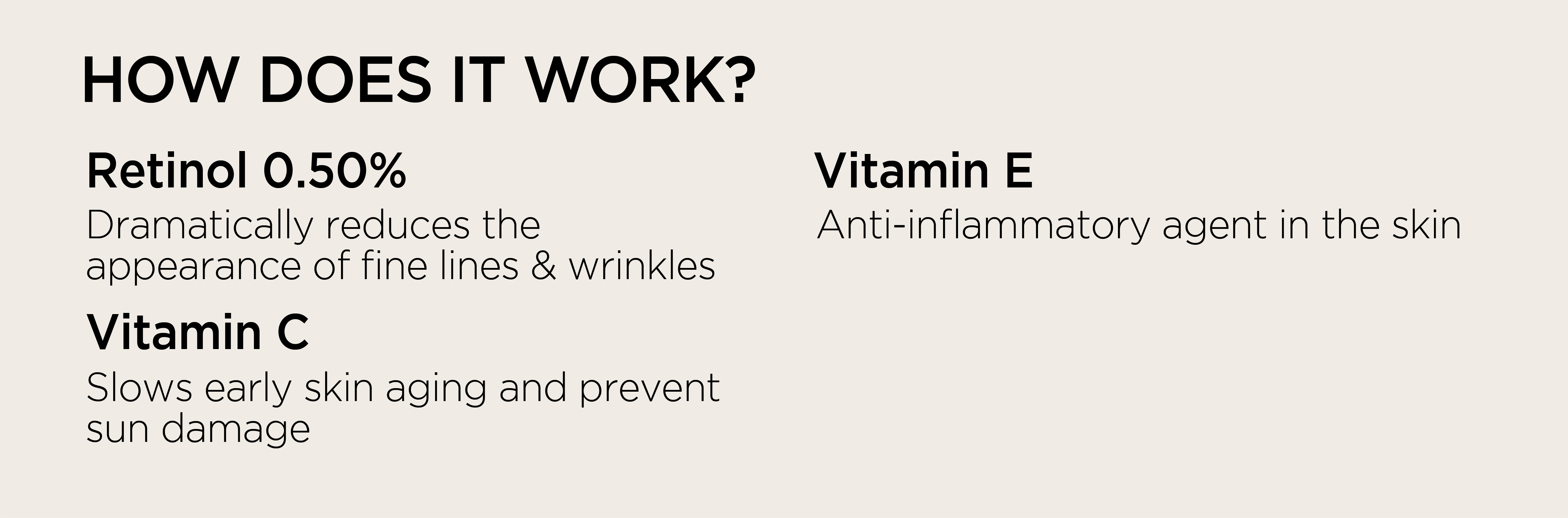 Patented Retinoid Complex (Tretinol®), formulated with a proprietary Trans-Epidermal Carrier, also includes Vitamins C and E to maximize the effectiveness of Retinol’s anti-aging benefits. It dramatically reduces the appearance of line lines, wrinkles deep creases, as well as brightens the skin.