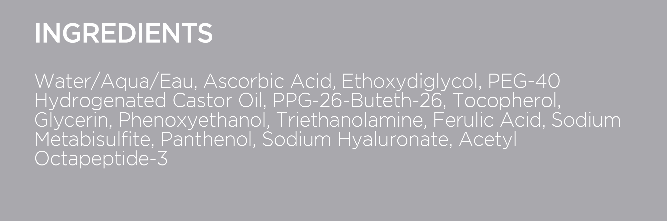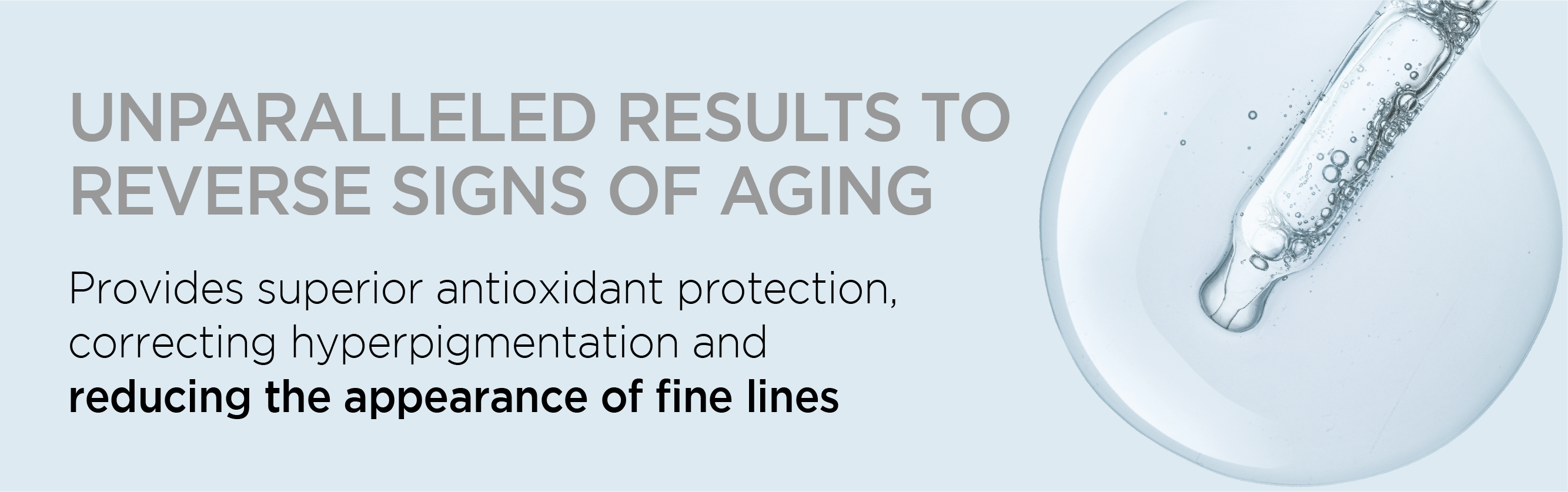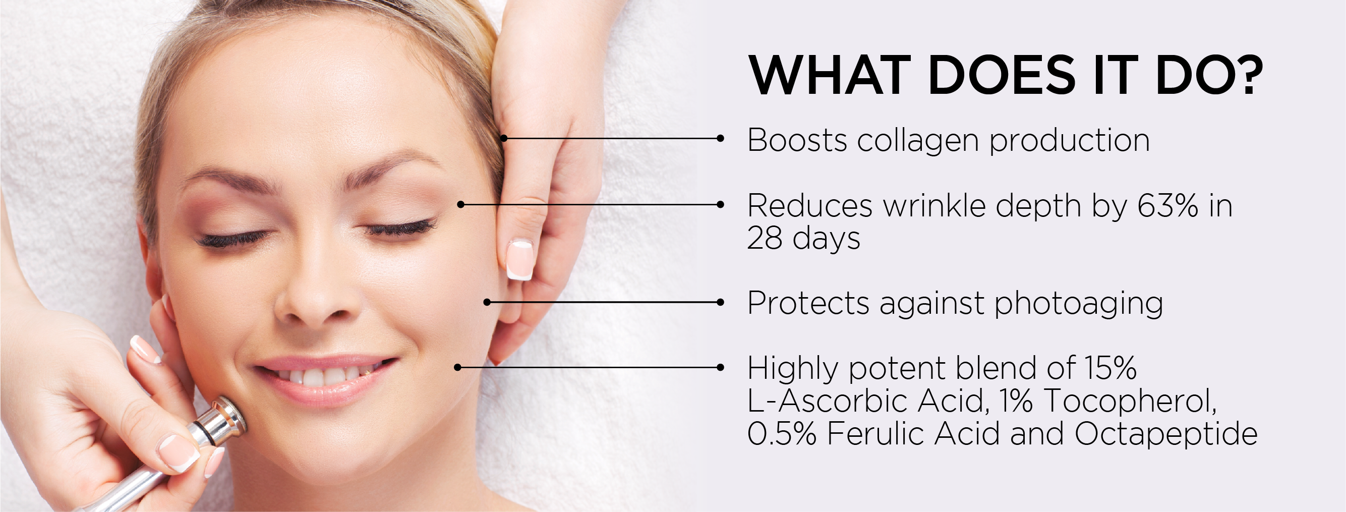 Multi-stabilized, highly potent Vitamin and Octapeptide-based anti-aging serum, intensified with a dual Trans-Epidermal Carrier, delivers unparalleled results to combat and reverse signs of aging through an increase in collagen production, provides antioxidant protection and treats hyperpigmentation.